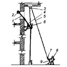 1 - канат УКСП; 2 - силовой элемент объекта или испытательного стенда; 3 - блок; 4 - тормозное устройство; 5 - страховочная веревка; 6 - испытатель; 7 - приспособление для экстренного заклинивания веревки; 8 - оператор, осуществляющий страховку испытателя; 9 - якорь Рисунок 4 - Схема страховки при спуске испытателей на УКСП 9.4.3 Изделие считают выдержавшим испытание, если: - не произошло ни одного случая неконтролируемого спуска испытателей; - не произошло ни одного случая заклинивания каната (ленты) УКСП; - не произошло разрушения или видимых деформаций элементов УКСП; - величина скорости спуска испытателей на УКСПа не вышла за пределы диапазона от 0,5 до 3,0 м/с; - конструкция УКСП обеспечивает возможность выполнения всех тактических приемов, указанных в руководстве по эксплуатации. 9.5 Проверка прочности УКСП при воздействии