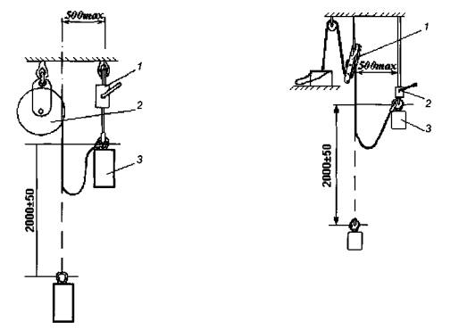 9. Методы испытаний9.1 Общие требования к проведению испытаний9.1.1 УКСП испытывают в состоянии, в котором они предлагаются потребителю. 9.1.2 Все испытания должны проводиться в нормальных климатических условиях по ГОСТ 15150, 3.15. 9.1.3 Перед испытаниями образцы выдерживают в нормальных климатических условиях в течение 24 ч, если не оговорено другое требование. 9.1.5 Образцы для испытаний выбирают методом случайного отбора. 9.2 Проверка комплектности и маркировкиКомплектность и маркировку УКСП на соответствие требованиям 6, 7 проверяют внешним осмотром трех образцов. УКСП считается выдержавшим испытание, если образцы соответствуют требованиям настоящего стандарта. 9.3 Проверка возможности спуска с помощью УКСП грузов, имеющих предельно допустимую массуИспытанию подвергают все отобранные образцы изделия. Испытание проводят на объекте или стенде, обеспечивающем возможность установки УКСП на максимальной для данного изделия высоте применения. 9.3.1 Проверка возможности спуска грузов с помощью УКСПа. УКСПа устанавливают на объекте или испытательном стенде и приводят в рабочее положение. Испытание проводят методом поочередного спуска контрольных грузов массой (40 ± 1) кг и (120 ± 1) кг, не менее трех раз каждый, с измерением скорости спуска с погрешностью не более ± 0,3 м/с. УКСПа считают выдержавшим испытание, если скорость спуска грузов ни в одном из опытов не вышла за пределы диапазона от 0,5 до 3,0 м/с. 9.3.2 Проверка возможности спуска грузов при помощи УКСПр Тормозное устройство УКСПр закрепляют на объекте или испытательном стенде. К концу каната, который при эксплуатации УКСПр должен крепиться на объекте, подвешивают контрольный груз, удерживаемый тормозным устройством в соответствии с методикой, указанной в руководстве по эксплуатации. Испытание проводят методом поочередного спуска контрольных грузов массой (40 ± 1) кг и (120 ± 1) кг не менее трех раз каждый. При испытании УКСПр, оборудованного рукояткой управления тормозным устройством, в процессе каждого спуска проверяют возможность регулирования скорости груза и его остановки, одновременно измеряя динамометром усилие на рукоятке, с погрешностью не более ±10 Н. Схема испытания указана на рисунке 1.