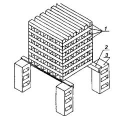 Поддон помещают под штабель таким образом, чтобы центры штабеля и поддона совпали. Штабель выставляют горизонтально относительно дна поддона.