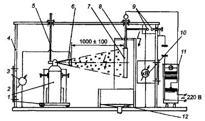 1 - изолирующая подставка; 2 - испытываемое устройство; 3 - измеритель тока утечки; 4 - защитный каркас испытательного стенда; 5 - устройство запуска; б - насадок устройства с электропроводным элементом; 7- мишень; 8 - экран; 9 - разрядник; 10 - киловольтметр; 11 - источник высокого напряжения; 12 - емкость для сбора отработанного ОТВ