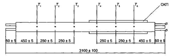 Рис. 1 - Размещение термоэлектрических преобразователей 4.1.3 Проведение испытания. Кабель подключают к регулируемому источнику электрического тока. Регулируя ток источника электрического тока, определяют значение тока I1 при котором показания прибора, регистрирующего температуру в точках 1-3, составляют (65 ± 3) °С в течение (3600 ±10) с. Аналогично определяют значение тока I2, при котором показания прибора, регистрирующего температуру в точках 4-6, составляют (65 ± 3) °С в течение (3600 ± 10) с. 4.1.4 Обработка результатов. Коэффициент снижения допустимого длительного тока нагрузки к определяют по формуле к = I2/I1 , (1) где I2 - значение тока, А; I1 - значение тока, А. ОКП соответствует требованию, если значение коэффициента снижения допустимого длительного тока нагрузки не менее 0,98. 4.2 Метод определения длины поврежденной пламенем или обугленной части кабельной прокладки с ОКП4.2.1 Для определения огнезащитной эффективности ОКП на кабелях с поливинилхлоридной, полиэтиленовой и резиновой оболочками испытания проводят на кабелях марок ААШв 3×120-10(ГОСТ 18410), ТППэп 50×2×0,4 (ГОСТ Р 51311) и КГ 3×50+1×16-0,66 [1] соответственно. Для определения огнезащитной эффективности ОКП на кабелях с иными оболочками или защитными покровами марку кабеля для испытания устанавливают представители испытательной лаборатории и согласовывают с производителем ОКП. 4.2.2 Аппаратура. Испытательная установка - по ГОСТ Р МЭК 60332-3-10. 4.2.3 Подготовка образцов. Длина отрезка кабеля, их количество и расположение - в соответствии с категорией А по ГОСТ Р МЭК 60332-3-22. Нанесение ОКП на кабели и его сушку осуществляют в соответствии с нормативной или технической документацией на покрытие. Контроль толщины покрытия производят в соответствии с приложением А. 4.2.4 Проведение испытаний по ГОСТ Р МЭК 60332-3-22. 4.2.5 Оценка результатов. ОКП соответствует требованию по нераспространению горения, если в результате испытаний длина поврежденной пламенем или обугленной части кабельной прокладки с ОКП не превышает 1,5 м, измеренная в соответствии с п. 6 ГОСТ Р МЭК 60332-3-22. Приложение А