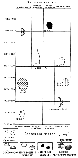 По результатам обследования составляется акт установленного образца, делаются соответствующие записи в тоннельной книге по выполнению незамедлительных мероприятий и составляется карта - развертка тоннеля с нанесением обнаруженных дефектов (Приложения Ж, И, Е).