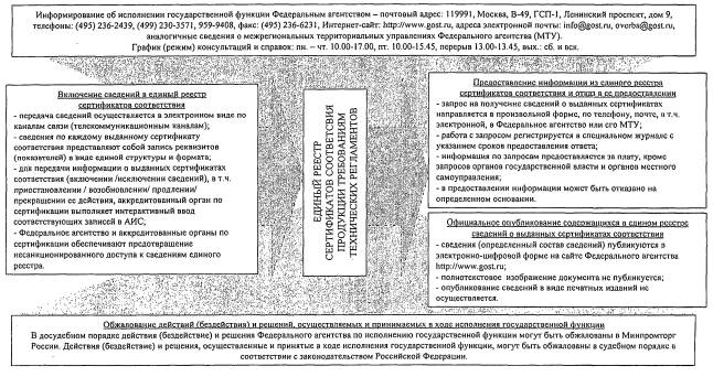 I. Общие положения1. Настоящий административный регламент устанавливает порядок исполнения Федеральным агентством по техническому регулированию и метрологии (далее - Федеральное агентство) государственной функции по организации формирования и ведения единого реестра сертификатов соответствия (далее - государственная функция). 2. Государственную функцию исполняет Федеральное агентство, а также его территориальные органы - межрегиональные территориальные управления (далее - МТУ) в части предоставления сведений о сертификатах соответствия, содержащихся в едином реестре сертификатов соответствия (далее - единый реестр). 3. Перечень нормативных правовых актов, непосредственно регулирующих исполнение государственной функции: Федеральный закон от 27 декабря 2002 г. N 184-ФЗ "О техническом регулировании" (Собрание законодательства Российской Федерации, 2002, N 52, ст. 5140; 2005, N 19, ст. 1752; 2007, N 19, ст. 2293; 2008, N 30 (часть II), ст. 3616); постановление Правительства Российской Федерации от 17 июня 2004 г. N 294 "О Федеральном агентстве по техническому регулированию и метрологии" (Собрание законодательства Российской Федерации, 2004, N 25, ст. 2575; 2004, N 44, ст. 4357; 2006, N 37, ст. 3881; 2008, N 24, ст. 2868); постановление Правительства Российской Федерации от 10 апреля 2006 г. N 201 "О порядке ведения единого реестра сертификатов соответствия, предоставления содержащихся в указанном реестре сведений и оплаты за предоставление таких сведений" (Собрание законодательства Российской Федерации, 2006, N 16, ст. 1740); постановление Правительства Российской Федерации от 30 января 2008 г. N 41 "О формировании и ведении единого реестра сертификатов соответствия" (Собрание законодательства Российской Федерации, 2008, N 5, ст. 410); приказ Министерства промышленности и энергетики Российской Федерации от 22 марта 2006 г. N 53 "Об утверждении формы сертификата соответствия продукции требованиям технических регламентов" (зарегистрирован в Минюсте России 15 мая 2006 г. N 7825, опубликован в Бюллетене нормативных актов федеральных органов исполнительной власти, 2006, N 21); приказ Министерства промышленности и энергетики Российской Федерации от 19 октября 2007 г. N 445 "О внесении изменений и дополнений в приказ Министерства промышленности и энергетики Российской Федерации от 22 марта 2006 г. N 53 "Об утверждении формы сертификата соответствия продукции требованиям технических регламентов" (зарегистрирован в Минюсте России 16 ноября 2007 г. N 10498, опубликован в Бюллетене нормативных актов федеральных органов исполнительной власти, 2007, N 49); приказ Федерального агентства по техническому регулированию и метрологии, Министерства промышленности и энергетики Российской Федерации и Министерства финансов Российской Федерации от 11 декабря 2006 г. N 3086/311/170н "О размере платы за предоставление по запросам сведений о сертификатах соответствия, содержащихся в едином реестре выданных сертификатов соответствия" (зарегистрирован в Минюсте России 19 января 2007 г. peг. N 8821, опубликован в Бюллетене нормативных актов федеральных органов исполнительной власти, 2007, N 6). 4. Результаты исполнения государственной функции: включение в единый реестр сведений о сертификатах соответствия, выданных аккредитованными органами по сертификации, сведений о приостановлении, возобновлении, продлении или прекращении действия сертификатов соответствия, а также перевод сведений