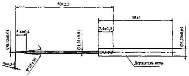 тормозное устройство; 6 - груз-шайба; 7 - игла и держатель; Пенетрометр снабжен дополнительным грузом - шайбой массой (50,00 ± 0,05) г или (150,00 ± 0,05) г. Масса иглы с держателем (2,50 ± 0,05) г, масса плунжера (47,50 ± 0,05) г. Конструкция пенетрометра обеспечивает перпендикулярное положение оси плунжера с иглой к плоскости столика. Неперпендикулярность плоскости столика к оси плунжера при любом угле его поворота не должна быть более 0,5 мм на длине 100 мм. Свободное вертикальное перемещение плунжера с иглой после отключения тормозного устройства происходит с минимальными потерями на трение, что обеспечивается зазором (от 16 до 52 мкм) между направляющей втулкой и плунжером. Параметр шероховатости соприкасающихся поверхностей направляющей втулки и плунжера Ra ≤ 0,8 мкм. Плунжер легко отсоединяется от пенетрометра для проверки его массы. Основание пенетрометра имеет регулируемые ножки-винты для установки его в вертикальное положение. На основании установлена ампула уровня по ГОСТ 2386. Пенетрометр имеет устройство, обеспечивающее возможность правильности подводки конца острия иглы к поверхности испытуемых битумов. Допускается использовать автоматические и полуавтоматические пенетрометры, соответствующие требованиям настоящего отраслевого методического документа. б) Размеры пенетрационной иглы соответствуют указанным на рис. б 1. Иглы пенетрационные изготавливаются из коррозионно-стойкой стали по ГОСТ 5632 и ГОСТ 18143. Твердость игл (55-61) НRСэ, параметр шероховатости поверхностей игл Ra ≤ 0,4 мкм. Цилиндрическое тело иглы имеет диаметр (1,01 ± 0,01) мм, конец иглы должен быть симметрично сведен к конусу, имеющему угол 9°10' ± 30' по всей длине конуса. Плоскость усеченной части конуса иглы должна быть перпендикулярна к ее оси. Отклонение перпендикулярности не более 2°. Диаметр кончика иглы (0,15 ± 0,01) мм. Длина иглы (50,0 ± 2,5) мм. Перед испытанием проводят визуальную оценку состояния иглы на предмет коррозии, формы, массы и т.д.