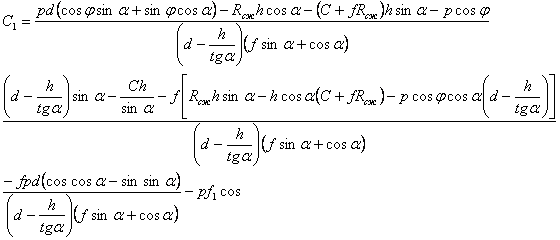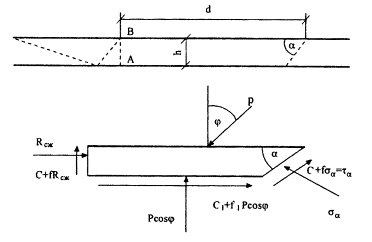 основанием; На рис. 1 сверху показан слой покрытия в момент предельного равновесия. Пунктиром обозначены поверхности нарушения сплошности покрытия, возникшие за счет сдвига его по основанию в случае недостаточной величины контактного трения и сцепления. В нижней части рисунка рассматривается часть покрытия с действующими на нее единичными усилиями. Нормальные напряжения по поверхности АВ принимаются в первом приближении равными пределу прочности материала покрытия на сжатие Rсж. По данным проф. Н.Н. Иванова, максимальное сдвигающее усилие от внезапно затормозившего автомобиля может достигать 0,75 вертикального удельного давлений [43]. Поэтому угол наклона силы Р был принят равным 49°, чтобы горизонтальная составляющая этой силы была равна 75%. Величину удельного вертикального давления приняли равной 0,6 МПа в соответствии с требованиями ОДН 218.046-01. Коэффициент повторности К, учитывающий многократность приложений тормозных усилий, в соответствии с рекомендациями Н.Н. Иванова принят равным 1,5. Приравнивая к нулю сумму проекций всех сил, действующих на направлениях σα и τα, и решая совместно уравнения, находим C1