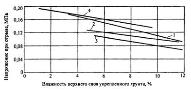 Рис. 3. Влияние влажности верхнего слоя укрепленного грунта на сцепление с ним пленки из битумной эмульсии: 1 - супесчаный цементогрунт, подгрунтовка - эмульсия на ССБ; 2 - суглинистый цементогрунт, подгрунтовка - эмульсия на Redicout; 3 - суглинистый цементогрунт, подгрунтовка - эмульсия на ССБ; 4 - супесчаный грунт, укрепленный цементом и битумной эмульсией, подгрунтовка - эмульсия па ССБ Результаты испытаний образцов приведены на рис. 3. Как видно из этого рисунка, зависимость прочности сцепления пленки из битумной эмульсии с поверхностью укрепленного грунта от влажности верхнего слоя в исследованном диапазоне влажности близка к прямолинейной. В результате проведенного корреляционного анализа выявлена тесная линейная связь между указанными выше параметрами. Коэффициент корреляции для всех четырех зависимостей находится в интервале 0,95 - 0,99. С уменьшением влажности верхнего слоя укрепленного грунта с 13 до 7% прочность сцепления с ним пленки вяжущего увеличивается за счет повышения адгезии пленки. На основании этого можно сделать заключение о том, что в этом интервале влажности прочность склеивания определяется, главным образом, адгезией пленки, так как при испытании образцов всегда наблюдали ее отрыв от поверхности укрепленного грунта. С дальнейшим уменьшением влажности верхнего слоя укрепленного грунта адгезионные силы сцепления пленки продолжают возрастать и начинают превосходить когезию вяжущего, оказывая все большее влияние на прочность склеивания. При влажности укрепленного грунта 2 - 5% адгезия пленки становится настолько большой, что прочность склеивания определяется, в основном, когезией вяжущего и разрыв образцов происходит по пленке битума. При нанесении дисперсного вяжущего (эмульсии) на оптимально увлажненный укрепленный грунт, капилляры и поры которого в верхнем слое заполнены водой, дисперсионная среда в виде водного раствора эмульгатора дополнительно увлажняет верхний слой и дисперсная фаза (битум) оказывается изолированной от него пленкой воды. Поэтому пленка битума плохо сцепляется с укрепленным грунтом и не проникает в его поры. При нанесении эмульсии на сухую поверхность укрепленного грунта (поры и капилляры которого лишь частично заполнены водой) адгезия пленки увеличивается за счет свободного заполнения пор и капилляров укрепленного грунта водным раствором эмульгатора, возникновением вакуум-эффекта и непосредственного контакта между вяжущим и поверхностью укрепленного грунта. Некоторое различие в адгезии пленок из битумной эмульсии на песчаном и суглинистом цементогрунтах объясняется различной минералогией грунтов и характером поровой структуры. Пленка, выделившаяся в результате распада катионной эмульсии, вытесняет воду с поверхности цементогрунта и в результате физико-химического взаимодействия эмульгатора с поверхностными ионами укрепленного грунта обеспечивает более высокое сцепление пленки в сравнении с пленкой, выделившейся в результате распада анионной эмульсии. Наибольшее сцепление пленки из битумной эмульсии было получено при нанесении ее на поверхность супесчаного грунта, укрепленного цементом совместно с битумной эмульсией. Хорошее сцепление пленки в этом случае в интервале влажности 4 - 10% обеспечивается аутогезионным взаимодействием между пленкой из битумно