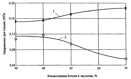 Рис. 4. Влияние концентрации битума в эмульсии на сцепление пленки из битумной эмульсии с укрепленным грунтом: 1 - влажность верхнего слоя цементогрунта 2 - 4%; 2 - то же, 7 - 9% Уменьшение влажности укрепленного грунта под плёнкой битума должно повлечь за собой усиление адгезионных связей пленки с поверхностью укрепленного грунта за счет процессов физической адсорбции и хемосорбции. Для подтверждения этого теоретического предположения были проведены дополнительные лабораторные исследования.