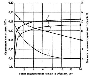где Р - максимальное усилие при отрыве, Н; F - рабочая площадь образца, см2 (площадь образца за исключением площади отдельных мест, где не произошло склеивания). Перед проведением основных исследований по приведенной выше методике были определены оптимальные дозировки используемых вяжущих при испытании на отрыв, которые находились в интервале 0,15 - 0,30 л/м2 (в пересчете на битум). Известно, что существующие в настоящее время методы ухода за укрепленными грунтами, а также постоянно меняющиеся погодные условия вынуждают строителей делать подгрунтовку под покрытия из плотных битумоминеральных смесей на укрепленном грунте, который имеет переменную влажность. Определяющая роль пленки подгрунтовки в обеспечении прочности соединения покрытия с укрепленным грунтом вызывает необходимость изучения влияния влажности укрепленного грунта на прочность сцепления с ним тонких пленок вяжущего. Подготовленные образцы после 13-суточного выдерживания в оптимальных условиях увлажнения перед нанесением вяжущего подсушивались в термостате при 50°С в течение разного времени (от 30 мин до 3 ч), что обеспечивало интервал влажности в верхнем слое укрепленного грунта от 1 до 13%. Для склеивания использовали анионную и катионную эмульсии.