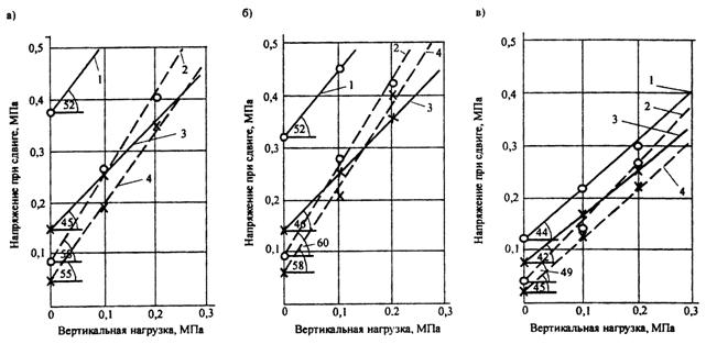 по формуле где P - сдвигающая горизонтальная нагрузка, Н; F - рабочая площадь при сдвиге, см2. Сначала по вышеприведенной методике были определены оптимальные дозировки битумной эмульсии и пасты, соответствующие максимальным сдвигающим напряжениям. Они оказались равными соответственно 0,15 и 0,30 л/м2. Для обоснования требований к сдвигоустойчивости в плоскости раздела и изучения влияния различных факторов на коэффициент трения и сцепление были проведены сдвиговые испытания нескольких двухслойных моделей с использованием в нижнем слое цементогрунта и грунта, укрепленного цементом совместно с битумной эмульсией. В качестве подгрунтовки использовали анионную битумную эмульсию. Испытания проводили при температуре 20 и 50°С с вертикальной удельной нагрузкой на образец в интервале 0 - 0,3 МПа. Результаты, полученные в процессе испытаний, приведены на рис. 6. Прямолинейные зависимости напряжений при сдвиге от величины удельной вертикальной нагрузки характеризуются известным уравнением Кулона τ = ptgφ + C. Сдвигоустойчивость черного щебня и мелкозернистого асфальтобетона превышает в 1,5 раза сдвигоустойчивость песчаного асфальтобетона и холодной смеси на пасте при равных вертикальных нагрузках за счет больших значений сцепления (зацепления) и коэффициента трения. Сцепление (С), обусловливаемое адгезией и когезией пленки подгрунтовки, зависит от состояния склеиваемых поверхностей и температуры испытуемых образцов. При использовании в качестве тонкослойного покрытия черного щебня и мелкозернистого асфальтобетона величина сцепления (зацепления) в 2 раза выше по сравнению с песчаным асфальтобетоном. С увеличением температуры испытаний с 20 до 50°С за счет уменьшения когезии битума величины сцепления также значительно снижаются. Коэффициент трения (tgφ) меняется в зависимости от вида применяемого покрытия (содержания щебня, остроугольности щебенок), состояния поверхности укрепленного грунта и температуры испытуемых образцов. Использование зернистого асфальтобетона при температуре испытания 20°С увеличивает угол φ всего лишь на 3°, при повышении температуры испытания до 50°С эта разница из-за уменьшения вязкости битума и возникновения контактов между зернами асфальтобетона и поверхностью укрепленного грунта увеличивается до 10°.