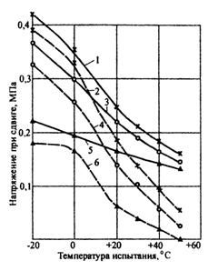 Рис 6. Влияние температуры и вертикальной нагрузки на сдвигоустойчивость в плоскости раздела: а - мелкозернистого асфальтобетона; б - черного щебня; в - песчаного асфальтобетона и битумоминеральной смеси на пасте; 1 - основание из грунта, укрепленного цементом и битумной эмульсией при 20°С; 2 - то же, 50°С; 3 - цементогрунтовое основание при температуре 20°С; 4 - то же, 50°С Наибольший угол φ (60°) был получен при испытании на сдвиг в плоскости раздела покрытия из черного щебня и основания из грунта, укрепленного цементом и битумной эмульсией. Увеличение угла φ в этом случае объясняется состоянием поверхности грунта, укрепленного двумя вяжущими материалами. Грунт, укрепленный цементом и битумной эмульсией, представляет собой гетерогенную систему, характеризующуюся наличием обработанных вяжущими грунтовых агрегатов и порами, заполненными битумом, которые при сдвиге черного щебня (особенно при высокой положительной температуре) способствуют увеличению коэффициента трения ввиду взаимного зацепления покрытия с основанием. Для изучения поведения различных вяжущих, используемых в качестве подгрунтовки, в широком диапазоне температур и выборе наиболее эффективного вяжущего, обеспечивающего максимальную сдвигоустойчивость в плоскости раздела при расчетной температуре 50°С, были проведены дополнительные исследования. Испытаниям на сдвиг подвергали образцы с тонкослойным покрытием из черного щебня, песчаного и мелкозернистого асфальтобетона, уложенным на супесчаный цементогрунт и грунт, укрепленный цементом совместно с битумной эмульсией. В качестве подгрунтовок использовали битумоизвестковую пасту, битумную эмульсию анионную и жидкий битум СГ 40/70. Вертикальное удельное давление на образцы составляло 0 и 0,1 МПа. Температура образцов при испытании (от -20 до +50°С) охватывает реально существующий диапазон температур верхних слоев дорожной одежды. Перед испытаниями образцы выдерживали в течение 3 ч при соответствующей температуре в термостате или холодильной камере. Типичный характер изменения сдвигоустойчивости в зависимости от температуры и типа подгрунтовки показан на рис. 7. Из этого рисунка видно, что сдвигоустойчивость в плоскости раздела мелкозернистого асфальтобетона и цементогрунта при повышении температуры снижается из-за уменьшения когезии вяжущего подгрунтовки. Если при температуре испытания -20°С сдвигоустойчивость покрытия, приклеенного различными подгрунтовками, отличается довольно значительно, то при увеличении температуры эта разница сглаживается и при испытании с удельной вертикальной нагрузкой 0,1 МПа при температуре 50°С сдвигоустойчивость для всех трех применяемых подгрунтовок находится в интервале 0,14 - 0,16 МПа. Сдвигоустойчивость образцов, испытуемых без вертикальной нагрузки, при этой же температуре для трех исследуемых подгрунтовок лежит в более широком диапазоне (0,002 - 0,06 МПа). Рис. 7. Влияние температуры на устойчивость в плоскости раздела: 1 - подгрунтовки битумоизвестковой пастой при вертикальной нагрузке 0,1 МПа; 2 - то же, без вертикальной нагрузки; 3 - подгрунтовки битумной эмульсией при вертикальной нагрузке 0,1 МПа; 4 - то же, без вертикальной нагрузки; 5 - подгрунтовки жидким битумом при вертикальной нагрузке 0,1 МПа; 6 - то же, без вертикальной нагрузки При низких температурах (интервал от -20 до 0°С) 