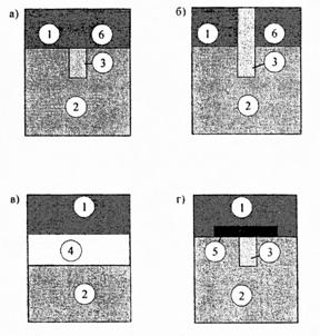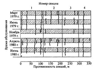 Рис. 12. Схема образования трещин на опытных секциях с комбинированным покрытием и на эталонном (заштриховано) асфальтобетонном покрытии: 1 - покрытие из черного высокопрочного гранитного щебня с заполнением битумным шламом верхней части слоя; 2 - то же, с заполнением битумным шламом нижней части слоя и закупоркой сверху; 3 - то же, с заполнением нижней части слоя; 4 - покрытие из черного известнякового щебня марки 400 с заполнением нижней части слоя и закупоркой сверху Стойкую способность к самозалечиванию отраженных трещин в летний период подтверждают многолетние обследования дороги в Татарии с основанием из цементогрунта толщиной 19 см и комбинированным покрытием толщиной 8 см. Обследования опытного участка протяженностью 500 м на этой дороге через 7 лет после начала эксплуатации подтверждают отсутствие в слое покрытия отраженных трещин. Способность к частичному самозалечиванию отраженных трещин в теплое время года проявляют и покрытия из холодных органоминеральных смесей, укладываемых на основания из укрепленных грунтов. Результаты обследований свидетельствуют также о довольно частом возникновении на таких покрытиях пластических деформаций в виде колей летом и выкрашиваний, образующихся зимой и весной от действия воды и мороза. В наибольшей степени подвержены разрушениям прикромочные полосы и участки между колеями, недостаточно уплотненные в процессе строительства и формирования покрытия. Обследования опытных участков и значительных по протяженности участков эксплуатируемых дорог с прослойками из щебня толщиной 10 - 15 см между цементогрунтовым основанием и асфальтобетонным покрытием подтверждают их высокую эффективность для исключения отраженных трещин. Как правило, после 3 - 5 лет эксплуатации в асфальтобетонном покрытии возникают самостоятельные трещины температурно-усадочного характера с шагом 10 - 15 м. Технико-экономические расчеты, проведенные с учетом фактических производственных затрат, показывают, что применение конструкций с основаниями из укрепленных грунтов и тонкослойными покрытиями из различных органоминеральных смесей позволяет существенно снизить стоимость дорожного строительства, поскольку реальная экономия при строительстве 1 км дороги составляет 6 - 20 тыс. р. (в ценах 1980 г.). При этом достигается экономия битума до 30 т, щебня - до 3500 т. ЗАКЛЮЧЕНИЕВ результате выполненного анализа и многолетних обследований дорог с тонкослойным покрытием или защитным слоем на укрепленном грунте можно сделать вывод о том, что основными критериями устойчивости конструкции являются сдвигоустойчивость в плоскости раздела основания и покрытия, устойчивость против образования трещин, способность противостоять износу. Одна из важнейших задач настоящей работы заключается в разработке требований к сцеплению различных типов тонкослойных покрытий с основанием из укрепленного грунта, обеспечивающих сдвигоустойчивость в зоне контакта при расчетной температуре. Для количественной оценки значения междуслойного сцепления и трения использован метод расчета по предельному равновесию. Проведенными позднее лабораторными исследованиями и испытаниями в полевых условиях были уточнены расчетные минимальные величины сцепления с учетом совместного действия подвижной нагрузки и климатических факторов и найдены 