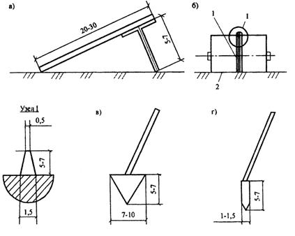 Рис. 11. Приспособления для нарезки швов в несформировавшемся укрепленном грунте: а - металлический сварной уголок; б - каток с клинообразной ребордой; в - приспособление для нарезки V-образного шва; г - приспособление для нарезки прямоугольного шва; 1 - клинообразная реборда; 2 - металлический каток Сразу же после нарезки шов заполняют герметиком, битумной или тиоколовой мастикой. В случае нарезки вручную V-образного шва шириной более 5 см его можно мастикой не заливать. Перед устройством покрытия на поверхность основания наносят подгрунтовку в виде жидкого битума (гудрона) или битумной пасты (эмульсии). Норма розлива подгрунтовки в виде битумной пасты составляет 0,3 - 0,5 л/м2, битумной эмульсии - 0,15 - 0,3 л/м2, жидкого битума (гудрона) - 0,4 л/м2. Наиболее целесообразно осуществлять подгрунтовку путем розлива катионной эмульсии марок ЭБК-1 и ЭБК-2. Время формирования пленки подгрунтовки из битумной эмульсии или пасты в зависимости от погодных условий составляет 30 - 120 мин. После формирования пленки подгрунтовки укладывают покрытие. Толщину покрытия при укладке на несформировавшееся основание следует принимать равной 6 см. Асфальтобетонную смесь желательно уплотнять комбинированными катками. Срок открытия движения транспортных средств со скоростью, не превышающей 40 км/ч, по построенному участку дороги с тонкослойным покрытием, уложенным на несформировавшееся основание, в зависимости от класса прочности укрепленного грунта и модуля упругости грунта земляного полотна (подстилающего слоя) приведен в табл. 5. Таблица 5
