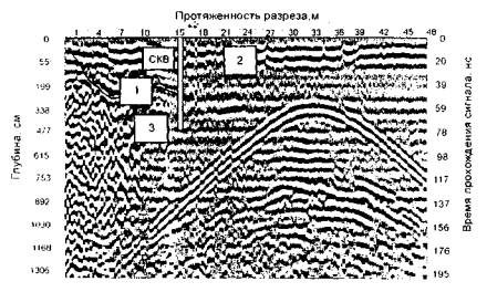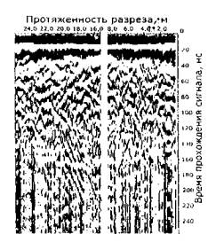 Рис. 14. Полевая радарограмма продольного разреза объекта «Карьер», полученная георадаром «ЗОНД-12», работающим на частоте 300 МГц