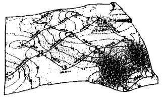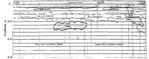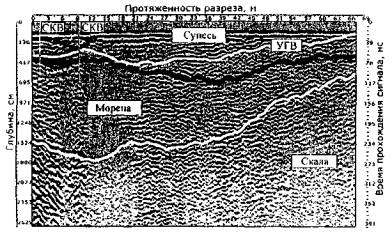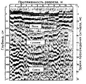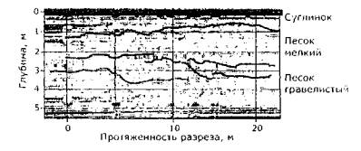 подошвы слоев: По результатам работ определено положение кровли и подошвы полезной толщи, положение уровня грунтовых вод и объем полезной толщи и вскрыши. При проведении работ в карьере «Песцовое» в Ямало-Ненецком автономном округе по заданию ДОАО «ВНИПИгаздобыча» ОАО «Газпром» ставилась задача определить границы размещения песчаных материалов на местности и вечномерзлого грунта, а также оценить запасы песка на участках уже разведанных по косвенным признакам карьеров. Песок предназначался для отсыпки земляного полотна автомобильных дорог. При разведке границ размещения полезной толщи оператор протягивал георадар по местности (длина непрерывного файла достигала 1 км) и по непрерывной радарограмме и характерным линиям синфазности на ней сообщал инженеру-геологу, на каком участке начинается переход от кондиционных материалов к пылеватым и наоборот, а также предварительно оценивал мощность полезной толщи и вскрыши (рис. 36).