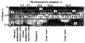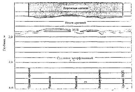 Рис. 17. Радарограмма продольного разреза дорожной конструкции с выделенным переувлажненным суглинком на участке просадки покрытия на автомобильной дороге «Кола» - Верхнетуломский - КПП «Лотта» По результатам работ был выявлен ряд ограничений при работе с георадаром: • нежелательно проводить работу с контактными антенными блоками в дождливую погоду, так как в случае нарушения герметизации антенных блоков возможен выход из строя оборудования; • плохие результаты получаются при работе с георадарами на засоленных грунтах или в соленой воде. В 2003 г. сотрудники ГП «Росдорнии» (научный руководитель. д-р техн. наук А.М. Кулижников) применили георадары с целью определения причин разрушений на 10 неблагополучных участках автомобильной дороги М10 «Россия». Георадарные обследования выполнялись двумя комплектами георадаров: • рупорным радаром «ДРЛ» с воздушными антеннами частотой 1000 и 2000 МГц для определения толщины конструктивных слоев дорожных одежд; • контактным радаром «ОКО-М» с антенными блоками АБ-250 и АБ-400 (соответственно с центральной частотой 250 и 400 МГц) для определения грунтово-гидрогеологических разрезов грунта земляного полотна и подстилающего полупространства. Замеры выполнялись в продольном направлении по правой крайней полосе (маршрут Москва - Санкт-Петербург) и в обратном направлении по левой крайней полосе. Измерения проводили по середине между колеями движениями. В поперечном направлении измерения осуществлялись от правой к левой бровке земляного полотна на каждом участке через 500 м. Наряду с георадарными работами оценивалось состояние покрытия, обеспечение водоотвода, водно-тепловой режим дорожных конструкций. Оценка выполнена в виде короткого описания с детализацией по участкам. Протяженность каждого обследуемого участка в среднем составляла 2,5 км. Участок 1. Краткое описание участка. На протяжении участка земляное полотно проходит в насыпи высотой от 0,5 до 2,0 м (4 м на небольшом протяжении), наблюдаются частые поперечные и отдельные продольные трещины на стыках полос движения. Колея отсутствует. Поперечный уклон на проезжей части обеспечен. Местами размыт откос насыпи. Боковые и водоотводные канавы на участках низких насыпей просматриваются плохо. По материалам диагностики: оценка состояния покрытия 3 балла, коэффициент прочности 0,75, что ниже требуемого значения; ровность 301-370 см/км, что не превышает допустимое значение 540 см/км. Анализ радарограмм продольных проходов позволяет заключить, что в основании насыпи находится суглинок легкий пылеватый. Высота насыпи из песка гравелистого, гравийного грунта и песка средней крупности изменяется от 1 до 2,0-2,2 м. Анализ радарограмм дорожной одежды в продольном направлении свидетельствует, что толщина слоя асфальтобетона изменяется от 0,13 до 0,38 м; слоя щебня - от 0,10 до 0,34 м. Участок 2. Краткое описание участка. На первой половине участка земляное полотно проходит в низкой насыпи, высота насыпи около 0,5 м. Боковые канавы просматриваются плохо: можно выделить ширину по низу 0,6 м, канавы заросли травой, заложение откосов канав 1:1 и 1:0,5. На второй половине участка земляное полотно проходит в низкой насыпи, высота насыпи около 0,5 м. С правой стороны -болотистая местность. На поверхности покрытия просматривается колея. Три полосы движения: две в направлении г. Санкт-Петерб