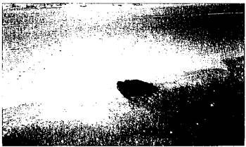 Рис. 27. Радарограмма поперечного разреза дорожной конструкции с выделенным «корытом» в основании насыпи из суглинка Промоины содержат пустоты, которые легко интерпретируются на радарограммах как чередующиеся толстые горизонтальные белые и черные линии. Размытые зоны с переувлажненными грунтами в их основании также содержат чередующиеся толстые полосы, однако они не имеют правильной геометрической формы и напоминают «мерцающие полосы». В подтверждение изложенного интересные работы были проведены в 2001 г. по договору с Департаментом дорожного хозяйства администрации Вологодской области на участке автомобильной дороги Тотьма - Нюксеница - Великий Устюг при пересечении ручья Пурный [20, 29]. В свое время здесь была уложена одна из первых водопропускных труб прямоугольного сечения размером 3´3 м и длиной 46 м. Высота насыпи над трубой превышала 12 м. Основной причиной аварийного состояния земляного полотна явилось попадание паводковых вод в тело земляного полотна снизу из-за нарушения сплошности водопропускной трубы. В свое время труба была устроена из железобетонных мостовых свай с омоноличиванием стенок бетоном и устройством лотка из сборных железобетонных дорожных плит. В течение последних лет было зафиксировано два паводка с расходом воды выше расчетного значения. В период этих паводков плиты подмыло и выбросило в водобойный колодец. Лоток оказался ниже уровня боковых стенок грубы. При обследовании трубы и был зафиксирован разрыв между стенками и лотком на величину провала лотка. Боковые стенки местами выкрошились и имели вертикальные трещины. В результате этого между сваями боковых стенок, а также между лотком и боковыми стенками вода просачивалась в подошву насыпи, что привело к вымыванию грунта из нижней части земляного полотна. В момент обследования правый откос насыпи был частично размыт. Откосы насыпи очень крутые и имели коэффициент заложения меньше требуемого. На данном участке автомобильной дороги из-за осадки земляного полотна была видна невооруженным глазом просадка на покрытии (рис. 28), а также на стыке покрытия с обочиной просматривалась промоина диаметром 30 см (рис. 29).