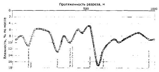 Рис. 31. График изменения влажности грунтов зенитного полотна по длине участка автомобильной дороги Москва - Санкт-Петербург, полученный по результатам георадарного сканирования Данного рода мониторинг был проведен на магистрали М10 «Россия» на территории Тверской (рис. 31) и Новгородской областей. Известно, что с помощью георадаров с одноканальными антенными блоками можно определить влажность грунта в нескольких случаях: • по радарограммам при известной толщине конструктивных слоев дорожной одежды и грунтов земляного полотна; • через диэлектрическую проницаемость при наличии локальных объектов (водопропускных труб, инженерных коммуникаций) в основании или геле земляного полотна; • при изменении расстояний между приемной и передающей антеннами. На 3-м неблагополучном участке автомобильной дороги Москва - Санкт-Петербург, проходящем по населенному пункту, были обнаружены очень часто расположенные локальные объекты (трубы подземных коммуникаций) на глубине около 1,5 м от поверхности покрытия, что и позволило определить влажность грунтов рабочего слоя земляного полотна. Влажность устанавливалась следующим образом: - по радарограмме сначала определялась диэлектрическая проницаемость среды, находящейся выше локальных объектов; - исходя из диэлектрической проницаемости, определялась влажность грунтов (по массе) по зависимости Е = 3,2 + 1,1W; где Е - диэлектрическая проницаемость, W - влажность грунта (по массе). Значения влажности, полученные сканированием, достаточно хорошо согласовались с результатами определения влажности грунта параллельно выполненным термовесовым методом. Результаты определения влажности с описанием меток приведены на графиках изменения влажности грунтов по длине автомобильной дороги (см. рис. 31). Точки на графике - участки дороги в продольном профиле, на которых определена влажность грунта. Анализ указанных графиков позволяет заключить, что в местах повышенной влажности грунтов на покрытии зафиксированы просадки, колееобразование, трещины, выбоины. Грунт земляного полотна и подстилающие грунты здесь сложены из супеси песчанистой пластичной, имеющей влажность на границе текучести 21,8 %. Следовательно, на тех участках, где влажность грунта уже превышает 0,7Wт (15,3% по массе), необходимо проводить работы по ее снижению. Осенью 2003 г. на протяжении обследуемых 2,5 км было выявлено 5 участков дороги (общей протяженностью 250 м), на которых влажность превысила 15,3%. Интересные результаты были получены и в аэропорту «Домодедово» (рис. 32). В работе принимал участие канд. техн. наук Л.Б. Каменецкий. Построенная картограмма позволяет определить участки различной влажности песков как по глубине, так и по длине аэродромной конструкции. Как показали исследования авторов обзорной информации, одной из основных причин образования трещин на поверхности цементобетонных плит явились дренажи, уложенные не под стыками плит, а по их середине.
