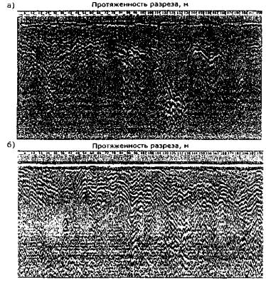 Рис. 33. Георадарный мониторинг за участком автомобильной дороги Москва - Архангельск, выполненный 28.04.2002 г. (а) и 28.10.2002 г. (б) В зонах просадки грунта зафиксирована аномалия скорости, которая авторами обзора интерпретирована как пустота. Причем это явление наблюдалось независимо от времени года. Размеры обнаруженных пустот имели площадь в плане до 4 м2 и глубину 0,3-0,8 м. Было предложено эти пустоты заполнить песчано-цементным раствором. В целях обеспечения остановки эрозии было рекомендовано восстановление системы продольного и поперечного водоотвода, что значительно снизит вероятность эрозии. Мониторинговые наблюдения за ходом промерзания и оттаивания грунтов. Авторами обзорной информации были выполнены георадарные работы на участках автомобильной дороги Москва - Архангельск, где мониторинговые работы велись на 7 участках, находящихся в 3 административных районах Архангельской области. Расстояние от первого участка до последнего составляло 250 км. Весной 2002 г. при одинаковых сроках закрытия участков дорог было установлено, что на протяжении 250 км глубина оттаивания дорожной конструкции изменяется от 0,9 м (северный участок дороги) до 1,6 м (южный участок дороги) от поверхности покрытия. Глубина оттаивания, превысившая толщину рабочего слоя, позволяла заключить, что на южном участке можно уже открывать движение транспортных средств, в то время как по срокам движение должно было быть открыто через 1,5 недели. Но глубинам промерзания или оттаивания грунтов, выявленным георадарными методами, можно назначить сроки или определить правильность периода закрытия автомобильной дороги. Более того, по глубине промерзания можно правильно оценить морозоустойчивость дорожной одежды. При мониторинге автомобильных дорог георадарные технологии являются высокопроизводительными, экономически эффективными, выявляют истинные причины разрушений дорог и ни в коей мере не оказывают неблагоприятного влияния на окружающую среду. По результатам мониторинговых работ назначаются эффективные виды ремонтных работ, которые повышают эксплуатационную надежность автомобильных дорог. Кроме того, выявив участки с повышенной влажностью грунтов земляного полотна, можно дать адресные рекомендации по обеспечению водоотвода и осушению грунтов земляного полотна. Мониторинговые работы позволяют уже сейчас оперативно управлять сроками закрытия и открытия дорог, а также устанавливать ограничения нагрузок. 5.4. Разведка и оценка запасов дорожно-строительных материалов в карьерахПервые работы были выполнены кафедрой автомобильных дорог Архангельского ГТУ в Вытегорском районе Вологодской области по заданию АООТ «Вологодавтодор» [35, 36, 37]. Эти работы показали, что при использовании георадаров можно значительно снизить количество дорогостоящих буровых скважин и получить непрерывные геологические разрезы. При выполнении работ используются георадары серии «ОКО» с антенными блоками АБ-150, АБ-250 и АБ-400. Первые две антенны предназначаются для оценки запасов полезной толщи, последняя - вскрышных работ. Гарантированная глубина зондирования при изменении частоты антенн от 400 до 150 МГц соответственно варьирует от 2 до 15 м при разрешающей способности от 0,15 до 0,35 м. В пористых материалах (гравийно-песчаная смесь, валунно-галечниковая смесь, крупнообломочные гр