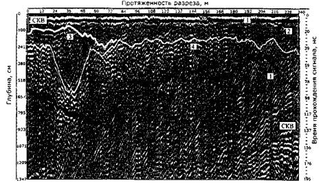 Рис. 35. Радарограмма карьерного разреза с выделением кровли и