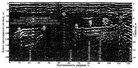 Рис. 3. Интерпретированная радарограмма продольного разреза объекта «Насыпь», полученная георадаром «ДРЛ», работающим на частоте 300 МГц