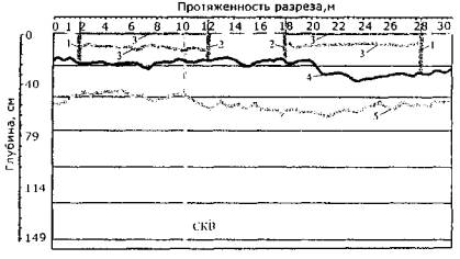 Рис. 22. Автомобиль с георадаром «ДРЛ» Еще одной областью применения геолокатора может быть его использование для определения толщины асфальтобетонного покрытия, уложенного на слой цементобетона. Такую информацию чрезвычайно важно получать перед фрезерованием покрытия, например, на путепроводах или в других местах, где толщина асфальтобетонного слоя ограничена. При этом, в случае заглубления фрезы до цементобетона, ее дорогостоящий рабочий орган может выйти из строя. Интересными представляются результаты, полученные при обследовании дорожных одежд с армированными цементобетонными плитами. Такие конструкции обследовали на территории Ямало-Ненецкого автономного округа [1]. Пробный проезд по армированным цементобетонным плитам показал, что георадары, работающие на частотах 1000 и 2000 МГц свободно сканируют конструкцию, практически не реагируя на арматурную сетку, находящуюся в плитах. С помощью георадаров возможно эффективно оценивать состояние подстилающих слоев, выявлять качество гидроизоляции температурных швов между плитами. При исследовании конструкции после продолжительного периода дождей на получаемых георадарограммах в области швов хорошо видны контрастные цвета, свидетельствующие о переувлажнении грунта, а значит о нарушении гидроизоляции. Известен опыт обследования дорог Санкт-Петербургским государственным горным институтом и ЗАО «Нева-Дорсервис» [22]. Для обследований дорожных одежд использовался георадар «ЗОНД» с антенными блоками с центральной частотой 900 МГц, а для промеров толщины слоев асфальтобетона - с частотами 1,5 и 2,0 ГГц, которые обеспечивали точность измерений до 1 см. При обследовании грунтов земляного полотна использовались низкочастотные антенны (500 и 300 МГц), изучающие разрез на глубину до 5-10 м при разрешающей способности 0,3-0,5 м. Работы выполнялись в трех режимах: непрерывное продольное, интервальное продольное и поперечное профилирование. Транспортировка георадара осуществлялась автомобилем, движущимся со скоростью до 10 км/ч. КБ «Радар» и ООО «Индор» (г. Томск) выполняли обследование автомобильных дорог георадаром с центральной частотой 700 МГц и шагом зондирования 0,1 м [24]. На каждом участке протяженностью 3 м определялась центральная частота спектра каждой реализации сигнала. Анализ показал, что центральная частота спектра сигнала на участке нового асфальтобетонного покрытия имеет плавный характер изменения, в то время как на старом покрытии наблюдаются резкие скачки соседних значений. Аналогичные исследования были проведены для дорог с грунтовым и гравийным покрытием. ЗАО «Технотавр» использовало георадар «ГРОТ» при обследовании автомобильных дорог Москва - Нижний Новгород, Москва - Минск, Самара - Уфа - Челябинск, подъезда к аэропорту «Внуково» и т.д. [23, 26]. Предварительные расчеты авторов обзорной информации показывают, что затраты на ремонтные работы после георадарных обследований автомобильных дорог уменьшаются не менее чем на 20-25% при повышении их эксплуатационной надежности. 5.2. Выявление зон локальных ослаблений в грунтах земляного полотнаС помощью георадарных обследований автомобильных дорог по радарограммам устанавливаются границы (подошвы) грунтов и положение уровня грунтовых вод. На рис. 23 приведены границы подошвы грунтов земляного полотна и подстилающего сло
