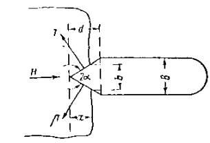 Расчетное динамическое давление на опору с вертикальной гранью. По-видимому, за расчетное динамическое давление на опору с вертикальной гранью следует принять наименьшее из давлений, определенных по формулам (3) и (7) или (8). В самом деле, если H2 < H1 то льдина остановится у опоры, оказывая давление H2. Прорезание льдины опорой отсутствует. Если H1 < H2, то льдина будет прорезаться опорой при максимально возможном давлении Н1. Давление, возникающее при прорезании крупного ледяного поля опорой с наклонной режущей гранью. Исследованиями [1] подтверждается возможность учета влияния ширины опоры в рассматриваемом случае. Напомним процесс разрушения крупного ледяного поля. При встрече с сооружением, снабженным наклонной ледорезной гранью, происходит смятие острой кромки льдины (рис. 2), сопровождающееся появлением реакции опоры, которую можно разложить на составляющие V1 и T, связанные между собой зависимостью