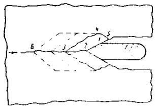 В этом выражении β1 - угол наклона боковых граней режущего ребра к горизонту, связанный с углом наклона режущего ребра (см. рис. 2) выражением [1] Под воздействием сил V1 и Т происходит излом ледяного поля, сопровождающийся появлением не менее трех опережающих трещин, выделяющих две полосы льда, от которых затем отламываются карты льда 2-3-4-5 (см. рис. 3). После этого давление на опору падает, трещины 3-2 и 4-5 смыкаются и льдина продолжает двигаться вперед, не испытывая серьезного противодействия до тех пор, пока опора снова не войдет в контакт с ней по линии 3-4 и явление не повторится. Таким образом, результирующее давление на льдину сводится к двум силам: V = 2V1 и H = 2Tsinα. Учитывая выражения (11) и (12) и вводя по Б.В. Зылеву коэффициент 1,1, учитывающий трение между опорой и льдиной, находим