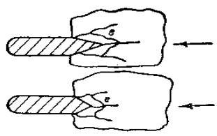 Рис. 4. Схемы разрушения ледяного покрова в зависимости от формы опоры в плане Расчетная прочность льда. Рекомендуемые СН 76-59 и СН 200-62 пределы прочности льда при раздроблении достаточно правильно характеризуют условия, наблюдающиеся при вскрытии рек СССР. Значения же предела прочности для определения ледовых нагрузок на опоры с наклонной гранью завышены вследствие допущенной неточности: расчетный предел прочности льда при раздроблении принят с учетом местного смятия, который отсутствует при изломе ледяного поля на режущей грани наклонного ледореза. Поэтому вполне возможно снизить расчетный предел прочности при учете давления на опоры с наклонной гранью. Так как в нормах СН 76-59 и СН 200-62 учтен также коэффициент неплотности соприкасания опоры и льдины, равный 0,75, то предел прочности изгиба может быть принят равным
