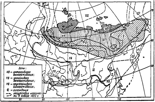 Рис. 5. Схематическая карта зон морозности Сибири и Дальнего Востока с температурой воздуха ниже -15°С по зоне: I - до 40 суток в году; II - от - 41 до 110; III - от 111 до 150; IV - от 151 до 160; V - от 161 до 170; VI - от 171 до 180; VII - от 181 до 190; VIII - от 191 до 200