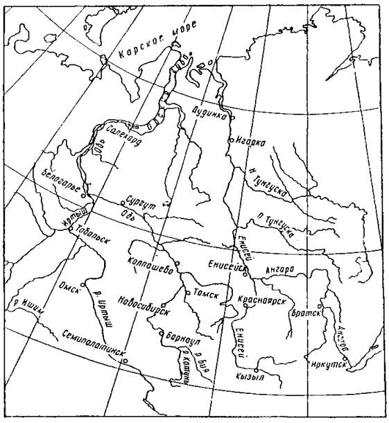 Рис. 1. Гидрографическая схема Оби и Енисея Ледовый режим рек Сибири отличается большим разнообразием, рассмотрим его применительно к таким рекам, как Ангара, Енисей и Обь. Ангара, Енисей и Обь - крупнейшие реки не только Советского Союза, но и мира, отличаются как многоводностью, так и своей длиной. Они имеют преобладающее общее направление течения с юга на север, пересекая ряд физико-географических зон (рис. 1). Верховья этих рек имеют значительные уклоны водной поверхности, постепенно уменьшающиеся к устью. Для территории, по которой протекают рассматриваемые реки, характерны суровая и продолжительная зима, способствующая образованию мощного ледяного покрова на реках, и короткие переходные периоды осени и весны. Осеннее похолодание наступает интенсивно с редкими случаями возврата тепла. Поэтому продолжительность осеннего ледохода на большинстве рек Сибири небольшая. Благодаря дружной весне вскрытие рек происходит при высоких подъемах уровня воды и еще сохранившемся толстом и прочном ледяном покрове. Это обстоятельство, а также общее направление течения рек с юга на север способствует образованию весенних заторов льда на реках. Общие закономерности образования зажоров Зажором называется скопление масс шуги с включением битого льда, снежуры и пр., создающее в осенне-зимний период стеснение русла реки на отдельном ее участке и вызывающее выше этого участка местное повышение уровня воды. Как правило, зажоры образуются на шугоносных реках в период формирования ледяного покрова, а также при ледоставе ниже полыней, являющихся очагами образования шуги. Шуголедовые процессы на реках представляют собой явления, зависящие от очень большого количества факторов. Учитывая, что в осенний период в Сибири происходит устойчивое нарастание отрицательных температур воздуха, шуголедовые явления рассмотрим в зависимости от продольного профиля водотока и скорости течения, от морфологических особенностей участка русла, от влияния водоподъемных плотин и др. Характер ледообразования на реках в сильной степени определяется скоростью течения. В потоках с незначительными скоростями (v ≤ 0,5 м/сек) и, следовательно, со слабым турбулентным перемешиванием, переохлаждение воды под влиянием отрицательных температур воздуха происходит в поверхностных слоях реки. Здесь и образуются кристаллы льда, быстро смерзающиеся в ледяные поля. Одновременно растут забереги. Ледяной покров устанавливается спокойно без образования практически значительных количеств шуги. При скорости течения более 0,5 м/сек вследствие интенсивного перемешивания и резкого увеличения теплопроводности водных масс переохлажденной оказывается не только поверхностная пленка воды, но и вся толща речного потока. Выделение кристаллов льда становится возможным в любой точке живого сечения реки, в том числе и у дна (донный лея). Всплывшие на поверхность реки массы внутриводного и донного льда образуют шугу. В состав шуги входят также комья снега и ледяная корка, возникающая на поверхности шуговых ковров. Скорости течения воды оказывают существенное влияние на характер транспортирования шуги потоком. Из наблюдений известно, что шуга в форме поверхностных ковров разной густоты и мощности наблюдается при скоростях, не превышающих 1,5 м/сек. При больших скоростях поверхностны