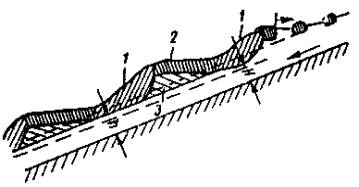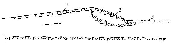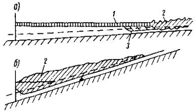 Рис. 2. Схема формирования ледяного покрова при скоростях течения vк2 < v < vк3: 1 - заторошенный участок ледостава, развивающийся при подныривании ковров под кромку; 2 - участок ледостава, формирующийся без подныривания ковров под кромку; 3 - отложение шуги под ледяным покровом В первом приближении А.С. Образовский рекомендует ∆Н определять по формуле ∆Н = 0,33φН + δ и h = 1,33φН, где Н - глубина .потока в открытом русле, м; h - глубина воды под ковром шуги, м; δ - глубина погружения шуги, м; φ – I : Iш; I - продольный уклон реки. Горные реки при скорости v > vк3. Формирование ледостава может происходить, как и в предыдущем случае, однако под шуголедяным покровом в той или иной мере будет транзит шуги. На вышележащем участке при скорости v > vк4 ледостав вообще не возникает. Вследствие этого вышележащий участок реки будет продуцировать внутриводный лед в течение всего зимнего периода. Вся масса этого шугольда будет поступать под ледяной покров участка со скоростями v < vк4. Шугозажорные явления будут развиваться в очень сложных формах, в некоторых случаях обусловливающих блуждание потока и потерю части его стока на наледные образования. Слабоизвилистые реки равнинного типа со ступенчатым профилем. Основным морфологическим элементом русла для этих рек является комплекс «перекат-плес». Скорости течения обычно изменяются в пределах: на плесах vк1 < v < vк2, на перекатах vк2 < v < vк3. В связи с этим шуголедовые процессы протекают по схеме, приведенной на рис. 3, а. Надвигающаяся снизу кромка ледостава вызывает некоторое повышение уровня ∆Н. Плес замерзает за счет остановившихся шуголедяных ковров. При подходе кромки к сечению, в котором начинается процесс подныривания под кромку, возникает зажор. Последний, вызывая подпор на перекате и прекращая подныривание, дает возможность кромке ледостава двигаться вверх по течению через перекат на вышележащий плес.