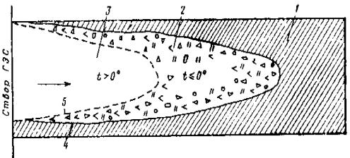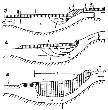 Рис. 3. Схема формирования ледостава на участке «плес-перекат»: а - при низких перекатах; б - при высоких перекатах с образованием полыньи, в - то же с перекрытием полыньи; 1 - часть ледяного покрова, формирующаяся без подныривания ковров шуги; 2 - отложения шуги под ледяным покровом; 3 - заторошенная часть ледяного покрова; 4 - ледяной покров на полынье; 5 - последующие отложения шуги в шугозажоре При высоких перекатах и малых скоростях в плесах кромка ледостава может возникнуть на плесе за счет смерзания шуговых ковров, а на перекате некоторое время может сохраниться полынья, в которой будет идти образование шуги. В этом случае ниже переката может получить значительное развитие зажор (рис. 3, б). Процесс перекрытия переката сохранится прежним: должен возникнуть подпор в результате развития зажора в верхней части плеса, после чего скорости на перекате уменьшатся и полынья покроется льдом (рис. 3, в). Порожистые реки со ступенчатым профилем. Развитие шуголедовых явлений на реках этого типа протекает аналогично предыдущему с тем отличием, что эти процессы развертываются в течение всей или большей части зимнего периода. В формировании зажора участвует значительное количество шуголедяного материала. Под тело зажора, формирующегося ниже порогов, шуговидная смесь поступает в сильно переохлажденном виде, поэтому процессы примерзания шуги к нижней поверхности зажора развиты более интенсивно. Скорости, обеспечивающие шуготранзит под тело или в теле шугозажора, потребуются соответственно большими 1,5 м/сек. Завлечение шуги в глубину в пределах формирующихся зажоров может быть очень значительным. Так, Ф.И. Быдин [12] отметил случай отложения шуги под ледяным покровом на глубине 18 м, а X. Барнес даже на глубине 27 м. Замечено, что зажоры ниже порогов подвержены непрерывному переформированию.