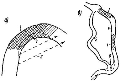 Рис. 4. Схема шугозаполнения русла: а - на излучине русла; б - в обходной протоке; 1 - место завязки очага шугозажора; 2 - контур заберегов; 3 - направление обходных проток; 4 - основное русло; 5 - рукав; 6 - заберег при входе в рукав Пороги в продолжение зимы могут оставаться открытыми и поставлять шугу в зажор в течение всего ледоставного периода. Участки рек с крутыми поворотами и разветвлениями русла. Крутые излучины часто являются местом формирования головы зажоров (рис. 4, а). Движущаяся шуга плотным слоем идет вдоль вогнутого берега, оставляя свободной часть поверхности у выпуклого берега, где образуются забереги, которые смыкаются с движущимся полем шуги, после чего начинается отложение шуги под заберегом. Если выпуклый берег как обычно невысок, то подпертая вода устремляется в обход плеса, вызывая иногда образование небольших проток. Это в свою очередь приводит к усилению формирования головной части шугозажора, который постепенно развивается вверх. Сложная ситуация складывается и на участках разветвленного русла (рис. 4, б). Если эта система симметрична, то на верховой стрелке острова обычно наблюдаются торосистые навалы шуги, а у корней верховых побочней формируются забереги. Небольшая разница в высоте перекатов или разница в густоте подходящих сверху ковров шуги у каждого из берегов приводит к тому, что один из перекатов, обычно с более высоким гребнем, полностью закрывается зажором. Точно прогнозировать возможную шуголедовую ситуацию очень трудно. В каждом отдельном случае необходим соответствующий комплекс наблюдений для выявления закономерностей замерзания реки. В годы с неустойчивым похолоданием сложность шуголедовых процессов, происходящих на реках, увеличивается (удлиняется период внутриводного ледообразования, подвижки зажоров, образование вторичных зажоров и др.). Верхние бьефы плотин. В верхних бьефах плотин на равнинных реках скорости течения воды незначительны. В тихую морозную погоду водохранилище замерзает, дружно покрываясь кристаллическим ледяным покровом. Если в период ледообразования наблюдается сильный ветер и массы воды перемешиваются ветровой волной, тогда в толще воды идет образование внутриводного льда, а на поверхности - шуговых ковров. После образования ледяного покрова большие скопления шуги отмечаются у наветренных берегов. Зажоры в подпертых бьефах образуются в зоне выклинивания подпора и выше (рис. 5, а). Шуготранзита по водоему обычно не наблюдается. Подпоры в руслах перед зажорами могут достигать 4-6 м. Интенсивность шуголедовых явлений в зоне выклинивания подпора зависит от особенностей водотока.