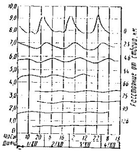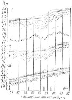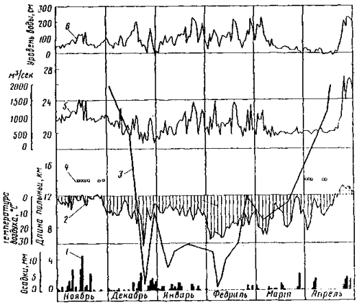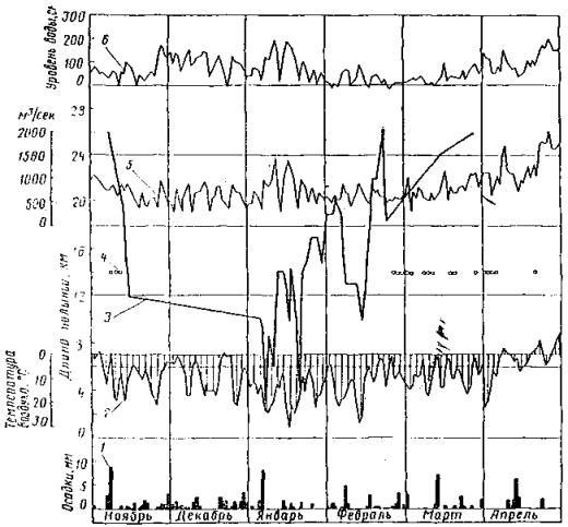 Рассматривая совмещенные графики колебания уровней воды по ряду водомерных постов, расположенных в нижнем бьефе (рис. 12), можно видеть, как идет распластывание волн попусков с удалением от ГЭС. Примерно в 100 км от плотины суточное регулирование стока Новосибирской ГЭС уже практически не сказывается на величине уровня воды в реке. В настоящее время в связи с созданием плотины нет поступления ледяного материала из водохранилища в нижний бьеф. Здесь ледоход образуется самостоятельно. После того как температура воды в реке на некотором расстоянии от ГЭС достигает 0°С и несколько ниже, начинается образование льда. Лед достигает прочности, необходимой для образования ледостава, далеко от плотины. Ледовыми авиаразведками, проведенными в 1959 г., установлено, что на день замерзания водохранилища (4/XI) кромка ледостава находилась в 280 км ниже створа ГЭС. В продолжение 4-10/XI кромка ледостава приближалась к плотине со средней скоростью 40 км в сутки и 11/XI была в 25 км ниже ГЭС. К середине декабря полынья достигла минимальных размеров, кромка ледостава находилась от ГЭС в 3-4 км. В этот период наблюдались низкие температуры воздуха и наименьшие за сезон расходы воды. Положение ледяной кромки в продолжение зимы не было устойчивым; в январе-марте размеры полыньи изменялись от 8 до 18 км. Ледостав в нижнем бьефе устанавливался спокойно с начальной толщиной ледяного покрова 5-10 см, поверхность которого была менее торосистой, чем это наблюдалось ранее в естественных условиях Оби. Кромка ледяного покрова в осенний период приближалась к плотине с большой скоростью. Это происходило в результате незначительной затраты ледяного материала на образование ледостава (начальная толщина ледяного покрова в условиях регулирования стока в 2-3 раза меньше, чем в естественных условиях, и в 4-5 раз меньше, чем это возможно определить по формуле К.И. Россинского [27]) и существенного влияния заберегов. Забереги в своем росте не встречали сопротивления со стороны плывущего льда, как ранее, и в связи с запаздыванием образования ледостава имели больше времени для своего роста. Ширина заберегов была значительно больше, чем на реке в естественных условиях. Плывущие ледяные поля легко заклинивались между заберегами, образуя ледяной покров. На значительном протяжении полынья представляла собой узкий незамерзающий канал - промоину шириной 50-75 м с рядом ледяных перемычек. В начале апреля в связи с повышением температуры воздуха до 0°С и выше, когда приход тепла к водной поверхности превышает расходную часть теплового баланса, размеры полыньи интенсивно увеличиваются. К 1/V 1960 г. кромка ледостава отступила на 180 км, а на момент очищения водохранилища от ледяного покрова (16/V 1960 г.) Обь была свободна от льда до устья Иртыша. Весеннего ледохода в нижнем бьефе ГЭС по существу не было. В ледяном покрове возникали промоины и лед постепенно таял на месте. Полынья удлинялась и расширялась. Общие закономерности образования заторов льда Затором, как известно, называется нагромождение льдин в русле реки во время ледохода, вызывающее стеснение живого сечения и связанный с этим подъем уровня воды. Заторы, образующиеся во время весеннего ледохода, на реках Сибири проявляются особенно ярко, вызывая высокие подъемы уровня; при осеннем ледоходе заторы здесь обычно меньше весенних, так как массы 