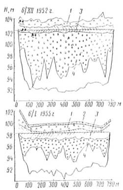 Подъемы уровней воды при ледоставе составляют обычно 60-100 см, что говорит о том, что зажоро-заторные явления в осенний период выражены несильно. Стеснение русла шугой и битым льдом не такое большое, как на Ангаре (рис. 11). Существенные зажорные явлении наблюдаются на верхнем участке Оби (исток - г. Камень), где подъем уровня при замерзании достигает 2 м. Создание водохранилища на Оби у Новосибирска существенно отразилось на сроках вскрытия и замерзания реки в верхнем и нижнем бьефах и характере ледовых процессов. Первые ледовые образования на водохранилище появляются в виде заберегов в те же сроки, что и на прилегающих участках реки. В дальнейшем ход ледообразования па водохранилище в значительной степени зависит от скорости ветра в районе и волнового режима водоема в этот период. В тихую морозную погоду переохлаждение воды наступает в поверхностных слоях воды, где и происходит ледообразование. Ледостав наступает дружно по всей акватории водоема без ледохода, как это наблюдалось, например, в 1948 и 1959 г.г. При этом водохранилище замерзает на несколько дней раньше реки в естественном состоянии (в 1958 г. на восемь дней, в 1959 г. на два дня). Чем интенсивнее наступает похолодание, тем больше разница в сроках замерзания реки и водохранилища. В случае сильного ветра и волнения процесс ледообразования на водохранилище протекает более продолжительное время по более сложной схеме (1960, 1961 г.г.). Возникновению ледяного покрова предшествует период переохлаждения воды на значительную глубину и образование льда и шуги. Процесс установления ледостава задерживается во времени и по площади акватории. Шуговые образования в виде шуговых ковров, ледяных дисков с трудом смерзаются при волнении между собой. Они переносятся течениями и ветром и образуют у наветренных берегов большие скопления. Так, осенью 1961 г. при господствующем в период замерзания ветре у левого берега водохранилища и плотины наблюдались забереги из шугового льда шириной до нескольких сотен метров. При снижении скорости ветра ледовые образования легко смерзаются между собой и образуется ледостав. Осенью 1960 г. ледоход на водохранилище наблюдался в продолжение шести, а осенью 1961 г. - 12 дней, причем в верхней суженной части водоема, где волновые явления выражены слабо, а скорости течения незначительны, водохранилище замерзало на 5-6 (1960 г.) и 12-15 дней (1961 г.) раньше, чем в нижней озеровидной зоне. Наблюдения показывают, что при слабом ветре в период ледообразования водохранилище замерзает по длине примерно в одинаковые сроки без ледохода. При сильном ветре верхняя суженная часть водоема замерзает значительно раньше нижней озеровидной зоны. Под влиянием поступающей из водохранилища относительно теплой воды в нижнем бьефе Новосибирской ГЭС в зимнее время наблюдается полынья. Величина незамерзающего участка в нижнем бьефе зависит от расхода и температуры воды, поступающей из водохранилища, скорости течения, морфологических особенностей русла, климатических условий сезона и других причин. Из-за непрерывного изменения гидравлических и метеорологических условий ледяная кромка находится постоянно в движении, приближаясь к гидроузлу при понижении температуры воды и воздуха и удаляясь при их повышении, в связи с чем длина полыньи меняется. Приближение ледяной кромки к гидроузлу вызыва