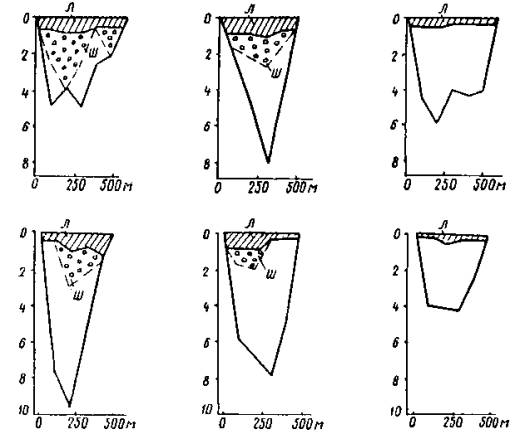Образование зажоров связано с особенностями установления ледостава на реке. Процесс образования ледяного покрова сильно растянут по времени. Вначале ледяной покров устанавливается в низовьях Ангары на мелководных перекатах и шиверах (середина ноября), в среднем течении - в конце ноября, а в верхнем - в конце декабря. Установление ледостава сопровождается образованием зажоров, чему способствуют своеобразный продольный профиль реки и большие скорости течения. На всем .протяжении Ангары в зимний период образуется каскад зажоров различной мощности. Особенно мощные зажоры располагаются в местах резкого перелома продольного профиля реки ниже порога. Поэтому особенно много зажоров образуется на среднем участке. Здесь, например, от г. Братска до с. Невон на реке образуется 14 крупных зажоров. В табл. 6 приведены сведения по некоторым зажорам на Ангаре, а на рис. 7 и 8 - характерные разрезы по ним. Из таблицы следует, что толщина слоя шуги в зажоре может достигать 7-8 м, а подъем уровня воды 5-9 м. Таблица 6