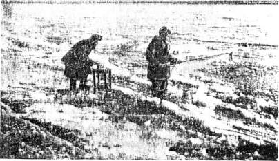 Рис. 6. Шугоход на Ангаре Вследствие ступенчатого профиля реки шуга и лед в процессе транспортирования претерпевают значительные изменения. На плесовых участках отдельные скопления шуги и льдины смерзаются между собой в ледяные поля. Проходя через пороги и шиверы, ледяные поля снова распадаются па отдельные льдины. Продолжительность шугохода на Ангаре зависит от времени прохождения через тот или иной створ нулевой изотермы и кромки льда, от длины ледообразующего участка, а также от образования выше по течению зажоров и заторов льда, дающих новое начало кромки ледяного покрова. Продолжительный ледоход наблюдается в верхнем течении Ангары (табл. 4). Здесь длина ледообразующего участка настолько мала, что льда не хватает на формирование ледяного покрова и шугоход принимает затяжной характер. Толщина плывущего слоя шуги изменяется в больших пределах: па верхнем участке реки не превышает 1 м, в среднем и нижнем течении может достигать 2 м. Таблица 4