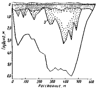Рис. 13. Схема затора: 1 - остановившиеся ледяные поля; 2 - заторные массы льда; 3 - сохранившееся ледяное поле Существенное влияние на процесс заторообразования оказывают суровость зимы и условия весеннего периода. В суровую зиму образуется мощный ледяной покров (на реках Сибири это обеспечено каждый год), при дружной весне происходит быстрый рост уровня воды в водотоках. Реки вскрываются при наличии прочного ледяного покрова, что в совокупности со значительными скоростями течения обусловливает интенсивный ледоход. Существование затора в данном месте не препятствует вскрытию реки на нижележащем участке. Ниже очага затора может наблюдаться ледоход, его прекращение и возникновение других очагов затора. Разрушение затора происходит под влиянием тепловых процессов и воздействия водного потока. Лед в заторе ослабевает, отрывается от берегов, всплывает и начинает двигаться. Иногда возникают подвижки льда в заторе, что может привести к его усилению. Затор может разрушаться и вследствие высоких скоростей течения и образования промоин, по которым сплавляются вниз массы битого льда. Заторы наносят существенный ущерб народному хозяйству. Льдом разрушаются речные и прибрежные сооружения, затопляются большие территории. Поэтому очень важно заранее предвидеть места образования заторов и их величину и обеспечить мероприятия по борьбе с заторами. В настоящее время существует ряд предложений по прогнозированию возможности заторообразования и величины максимального уровня [17, 31, 35, 49, 50]. И.Я. Лисер, например, прогнозирует места образования заторов исходя из решающего влияния условий замерзания рек на формирование очага затора. Им установлено, что при высоких уровнях ледостава, а также если при замерзании реки наблюдались подвижки льда, следует ожидать весной сильный или средний затор. Величину максимального заторного уровня рекомендуется определять совместным учетом условий замерзания, суровости зимы, интенсивности весенних процессов. Однако задача прогнозирования количественных характеристик затора с должной точностью еще не решена. Поэтому заторы часто оценивают по трехбалльной шкале: слабые, средние, сильные. Заторы на реках Сибири Река Ангара. Вскрытие Ангары обусловливается влиянием озера Байкал, общим направлением течения реки с юга па север, половодьями на притоках, морфологическими особенностями русла и метеорологическими факторами. На верхнем участке реки заторы обычно невелики и не вызывают значительных подъемов уровней. Здесь Ангара вскрывается сравнительно спокойно под влиянием тепловых факторов, усиливающихся наличием полыньи. На среднем н нижнем участках заторные весенние уровни на многих пунктах наблюдений являются высокими годовыми уровнями, превышающими зажорные. Исследованию ледотермического режима Ангары, как указывалось выше, уделено большое внимание. Но из-за трудности получения исчерпывающих материалов, характеризующих заторообразования, заторные явления на реке изучены недостаточно. Река Енисей. Впервые заторные явления на Енисее были описаны Е.В. Близняком в 1915, 1916 г.г. [8, 9]. Им был собран обширный материал, характеризующий ледовый режим реки на большом протяжении. В последние годы изучением весенних ледоходов и образованием заторов на этой реке занимался И.Я. Лисер [30, 31]. Поэтому о затора