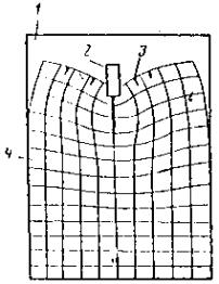 Рис. 1. Схема установки: 1 - лоток; 2 - штамп; 3 - снег; 4 - трос; 5 - блок; 6 - кран; 7 - груз Создавая заполнением воды из водопровода в бак нагрузку, ее постепенно и равномерно увеличивали от нулевого до разрушающего значения. Отмечено, что с момента приложения нагрузки снег как под штампом, так и во всем массиве начинал деформироваться, а при постоянной нагрузке отмечалось пластическое течение. Нанесенная на поверхность прямоугольная сетка искривлялась, правильные квадраты деформировались в фигуры, напоминающие ромбы с криволинейными сторонами (рис. 2). При нагрузках, близких к разрушающим, снег под штампом выкрашивался и образовывалась продольная трещина, распространяющаяся по оси лотка на всю толщину образца. В большинстве случаев образец разрушался, прорезаясь с резким продвижением штампа (рывком).