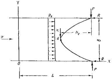 Суммарная нагрузка на перемычку составит Определение давления зажорной массы на ледовую перемычку в предположении образования разгружающего свода. Как известно, на сооружение, расположенное в толще грунта на большой глубине, давит не весь вышележащий грунт, а только часть его. Для определения давления на сооружения, глубоко расположенные в грунте (тоннели), широко применяют теорию образования разгружающего свода, разработанную М.М. Протодьяконовым. Согласно этой теории в толще грунта образуется разгружающий свод, который воспринимает давление от вышележащих слоев сыпучего тела, а на сооружение оказывает давление лишь масса грунта, расположенная ниже разгружающего свода. Принимается, что нагрузка на свод от вышележащих слоев грунта равномерно распределена по длине пролета свода, а так как сыпучее тело не сопротивляется действию растягивающих усилий, очертание оси свода принимает форму квадратной параболы. Применяя теорию М.М. Протодьяконова для определения давления на ледовую перемычку, будем полагать, что в русле реки образуется как бы разгружающий свод, который опирается на берега и благодаря силам трения зажорной массы о берега находится в состоянии равновесия при действии на него зажорных масс, расположенных выше по течению (рис. 4).