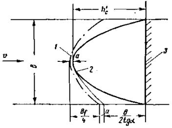 Рис. 5. Схема нижней грани и осп разгружающего свода: 1 - ось свода; 2 - нижний грань свода; 3 - ледовая перемычка; а - половина высоты свода в замке Выражение для стрелы подъема нижней грани разгружающего свода запишется так