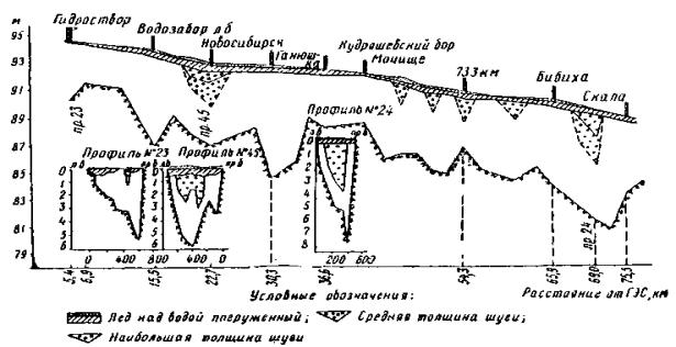 По характеру течения Енисей можно отнести к описанному выше типу - слабоизвилистые реки равнинного типа со ступенчатым профилем. Скорости течения на плесах изменяются в пределах vк1 < v < vк2, на перекатах vк2 < v < vк3. Шуголедовые процессы протекают примерно, как изображено на схеме рис. 3, а, за исключением устьевого участка реки, где скорости течения небольшие и река замерзает как слабопроточное водохранилище. В нижнем течении реки ледоход формируется за счет льда поверхностного образовании, в среднем и верхнем наблюдается интенсивное образование внутриводного льда (шуги), особенно на порожистых участках. Здесь в процессе ледохода участвует и шуга, и лед поверхностного образования. Значительное количество шуги в Енисей поступает из горных и порожистых рек: Абакана, Маны, Ангары, Подкаменной и Нижней Тунгуски и др. В устье Енисея ледяной покров образуется почти без ледохода. Отсюда кромка ледостава распространяется вверх по реке со скоростью 30-50 км в сутки и за 6 суток достигает Туруханска [5], от Туруханска выше по течению кромки ледостава передвигаются со скоростью 40 км в сутки и через 15 суток подходит к месту впадения Подкаменной Тунгуски. Одновременно на Енисее образуются новые очаги ледостава: ниже Осиновского порога в среднем 8 ноября, у д. Атаманово, в 70 км ниже Красноярска, 10 ноября, вблизи Минусинска 15 ноября. Ледяные перемычки на Енисее, как отмечает Н.П. Бахтин [5], образуются в местах резкого снижения скорости потока на глубоких, но суженных участках реки, где накапливается шуга и лед и при сильных морозах быстро смерзается. Ниже ледяных перемычек долго сохраняются полыньи. С начала ледостава уровень воды в реке быстро повышается вследствие влияния подпора, образующегося в результате появления ледяного покрова и зажоров. Величина шуголедяных зажоров и осенних заторов на Енисее меньше, чем на Ангаре. Повышение уровня составляет: у Кызыла - 2-3 м, Означенного и Красноярска 1,5-2 м и только ниже впадения Ангары подъем уровня довольно высок и составляет у Енисейска 4-5 м. Ниже Игарки образование ледостава часто наблюдается без ледохода, здесь не образуется зажоров, поэтому значительных повышений уровня не происходит. В случае осенних подвижек льда живое сечение реки иногда значительно забивается шугой и битым льдом, вследствие чего образуются мощные зажоры. Подобный случай описан И.Я. Лисером [32]. Осенью 1957 г. ледостав на Енисее в. районе Красноярска наступил 18/XI при весьма высокой отметке уровня воды. Подъем уровня при ледоставе составил 2,2 м, что на 0,9 м выше нормального. В течение ночи с 18 на 19/XI уровень повысился еще на 56 см. В это время наступило потепление до 0,2°С. В связи с потеплением и высоким уровнем воды при установлении ледостава во второй половине дня 19/XI на Енисее у Красноярска произошла подвижка льда. Подвижка продолжалась около 4 ч и распространилась на участок реки длиной примерно 25 км. Уровень воды при подвижке изменялся незначительно. Лед при подвижке в районе Красноярска перемещался довольно быстро сплошной массой без заметного разлома смерзшегося ледяного покрова на части. Двигался он лишь по центральной части реки. Однако не везде движение льда при подвижке проходило спокойно. В ряде мест ледостав после подвижки устанавливался бурно со значительными нагромождениями льда и взломом заберегов. Маршрутная ледоме