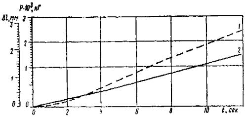 Рис 2 Осциллограмма деформирования образца ледяного покрова при сжатии: 1 - нагрузка Р = f(t); 2 - деформация ∆l = f2(t) Уравнение (1) может быть решено для различных условий нагружения [8, 9] как относительно σ, так и относительно ε. В приложении к рассматриваемому вопросу прежде всего представляет интерес решение приведенного уравнения при условии постоянной скорости нагружения. Такие режимы нагружения проведены при испытаниях образцов льда (рис. 2) В этом случае решение уравнения (1) в конечном итоге дает следующее выражение для связи между деформацией, скоростью и продолжительностью нагружения: