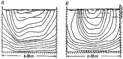Рис. 1. Изотахи дна лотка: а - со стеклянными стенками, б - с шероховатыми стенками из керамзитовых шариков Теперь представим себе, что периметр лотка имеет неоднородную шероховатость. Это могут быть потоки под ледяным покровом, где коэффициент шероховатости ледяного покрова и русла потока неодинаков. В этом случае на протекание потока влияние периметров с различной шероховатостью будет проявляться с неодинаковой силой. Поэтому приведенный коэффициент шероховатости nпр таких русел будет зависеть от соотношения периметров с различной шероховатостью, а для прямоугольных потоков - в конечном итоге от глубины наполнения. Как показали опыты, зависимость эта имеет сложный характер. Опыты проводили для исследования некоторых вопросов гидравлики потока под ледяным покровом. Для исследования этого вопроса необходимо обоснованно выбрать расчетную схему. Возможны две схемы: - ледяной покров не связан с берегами, т.е. свободно плавает на поверхности и следует за колебаниями горизонта воды; - при известных условиях ледяной покров может смерзаться с берегами. В