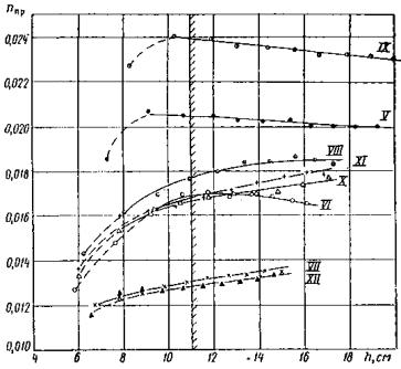 Рис. 2. Зависимость nпр от глубины потока в лотке: V-XII - номера серий опытов Поскольку не ставили цели определения истинной величины nпр, а лишь на основании опытов устанавливали характер зависимости nпр в потоках под ледяным покровом при изменении глубины наполнения, то значения коэффициентов nпр, nл и nр подсчитывали по формуле Маннинга, хотя в течение последних лет появился ряд новых формул для коэффициента Шези. На графиках изменения nпр вертикальной линией отделены друг от друга две области, имеющие различный характер. Первая область на рис. 2 находится слева от вертикальной линии, а на рис. 3 эта же область находится справа от вертикальной линии. Большинство точек этой области получено путем экстраполяции. Первая область характеризуется тем, что для всех серий опытов кривые имеют одинаковую тенденцию, а именно: значение nпр увеличивается с увеличением глубины равномерного режима, или, что то же самое, с уменьшением соотношения χл/χр.