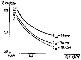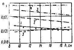 Рис 4. Зависимость предела прочности льда на сжатие от скорости нагружения При оценке предела прочности льда по данным кратковременных испытаний образцов на стандартных испытательных машинах, безусловно, следует учитывать скоростной режим их нагружения. Нагружение при опытах было скоростным, но все же статическим, т.е. не имело характера ударного нагружения. Имея в виду асимптотический характер зависимостей между прочностью и скоростью нагружения, можно предполагать, что в диапазоне ударных скоростей нагружения они не будут уже оказывать существенного влияния на оценку прочности. Однако это предположение требует экспериментального подтверждения путем уже упоминавшихся динамометрических измерений давления льда на сооружения с осциллографированием его изменения во времени. Для определения динамических нагрузок впредь до проведения таких исследований расчетную прочность льда следует принимать по данным испытаний образцов с возможно высокими скоростями нагружения. ЛИТЕРАТУРА 2. Цытович Н.А, Сумгин М.И. Основания механики мерзлых шунтов. М., изд-во АН СССР, 1937. 4. Коржавин К.Н. Воздействие льда на инженерные сооружения. Изд-во СО АН СССР. Новосибирск, 1962. 7. Войтковский К.Ф. Механические свойства льда. М , изд-во АН СССР, 1960. 8. Рейнер М. Реология. М., изд-во «Наука», 1965. Канд. техн. наук У.С. РОСЬИЗМЕНЕНИЕ ПРИВЕДЕННОГО КОЭФФИЦИЕНТА ШЕРОХОВАТОСТИ В ЗАВИСИМОСТИ ОТ ГЛУБИНЫ ПОТОКА ПОД ЛЕДЯНЫМ ПОКРОВОМВ гидравлике открытых русел под профилем скоростей по вертикали понимают график изменения продольных осредненных скоростей в функции от координаты у. Направление этой координатной оси выбирается обычно вертикальным от дна к свободной поверхности. В свое время Базен и Бахметев опытами установили, что максимальная скорость находится на поверхности открытого потока при отношении ширины его к наполнению b/h ≥ 5. Из опытов В.Н. Гончарова следует, что даже при b/h = 10 максимальная скорость находится ниже свободной поверхности. Поэтому рекомендация считать поток плоским при определенных значениях b/h зависит в основном от той точности, которая обеспечена при определении пропускной способности лотков. Безусловно, влияние боковых стенок на распределение скоростей по вертикали проявляется при самых различных отношениях b/h. При большем наполнении лотка это влияние распространяется на большее расстояние от стенок. Подобное влияние оказывает и шероховатость боковых стенок: чем больше коэффициент шероховатости стенок, тем сильнее проявляется их влияние (рис. 1).