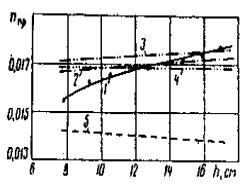 при быстром увеличении глубины всего на В процессе проведения опытов соотношение шероховатостей ледяного покрова и русла меняли в пределах 0,5-2,37, что наиболее часто встречается в натурных данных. Методика определения опытов и схема установки известны [2]. Опыты проведены в квадратичной области турбулентной зоны. На основании опытных данных показано изменение nпр (рис. 2) от глубины равномерного режима для нескольких серий опытов, выполненных при определенных значениях nл/nпр.