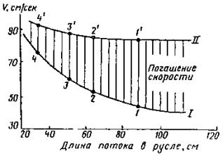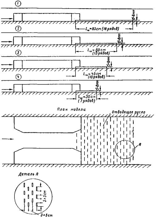 искусственного сооружения была установлена в лотке шириной При проведении опытов трубкой Пито-Ребока измеряли скорости в различных сечениях: на выходе потока из сооружения, в сечении максимальной ширины растекания потока в отводящем русле и других характерных сечениях. Для определения глубин в этих сечениях измеряли отметки свободной поверхности потока и дна лотка. Вначале исследовали протекание потока в гладком отводящем русле (дно и стенки лотка стеклянные), потом в русле с повышенной шероховатостью (из брусков) и при одинаковых расходах проводили соответствующие измерения. Это давало возможность устанавливать эффективность гашения скорости потока при конкретном типе шероховатости. Протекание