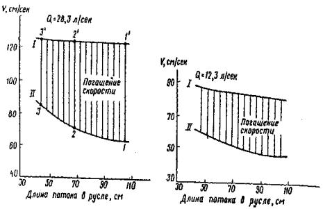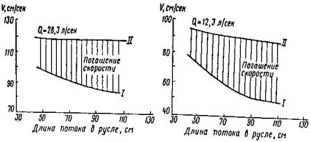 Рис. 3. Эффективность гашения скоростей в отводящем русле с помощью искусственной шероховатости (Q = 12,3 л/сек) В