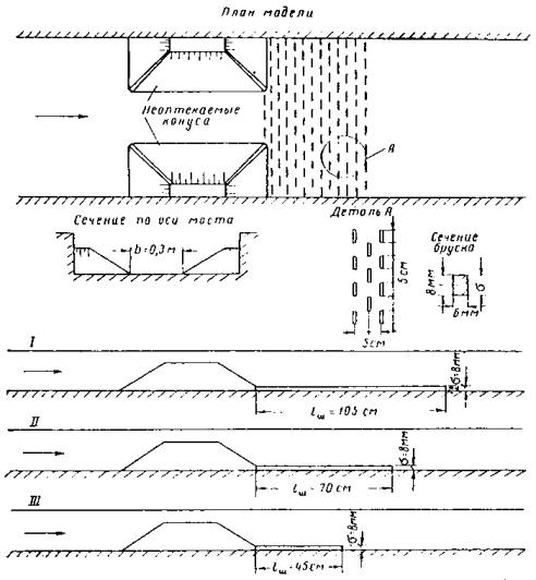 между брусками и отдельными их рядами по Бруски шероховатости сечением 8×12 см устанавливали аналогично указанному на рис. 5. В опытах данной серии через сооружение (мост) пропускали расходы: 5,8; 12,3; 19,8 и 28,3 л/сек. Поток в отводящем русле протекал по схеме свободного истечения, т. е. без подтопления со стороны нижнего бьефа.